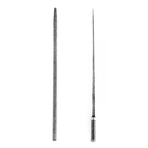 Sword-stick of wood with turned ivory pommel set with silver pique decoration with the initials "I.T." and date "1702".