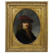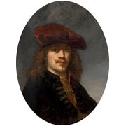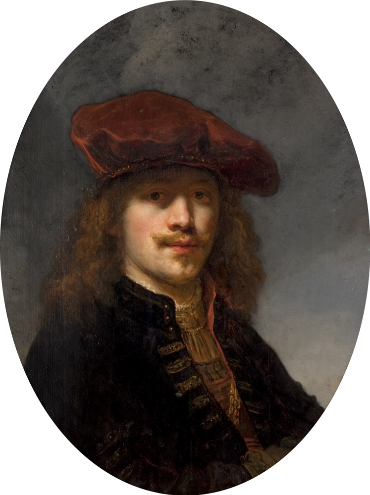 That it was so long attributed to Rembrandt is not surprising. Govert Flinck’s style in the 1630s was closely modeled on the master and even in his own lifetime it is known that his paintings were sometimes sold as Rembrandt’s. It is also very close in type to several painted and etched self-portraits by Rembrandt. The painting is now an oval shape but was originally rectangular. The background has been overprinted in a rather cold grey tone. Flinck painted a number of portraits of Rembrandt and his wife Saskia.