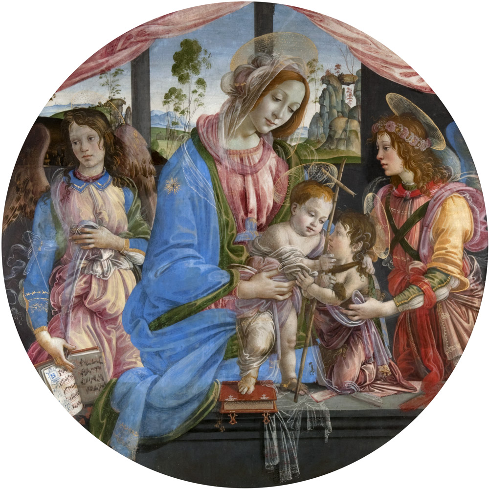 This painting by Raffaellino del Garbo depicts the Virgin, here in a red dress and blue mantle with golden nimbus above, holding the Holy Child who in turn is seen embracing St. John, who kneels before Him.