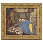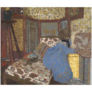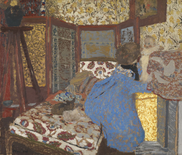 Until recently this painting was thought to show Vuillard's sister, Marie and her baby daughter. The woman in the painting has, however, been identified as Vuillard's muse, Misia Natanson, and the baby as her half-brother Cipa's first child Mimi Godebska. This claustrophobic room, a riot of floral patterns was in the Natanson's Parisian apartment. Drawn into the painting by rich colour and by a profusion of surfaces and textures, the viewer is presented with a roomful of puzzles. There are numerous ambiguities of form and space, for example, is that a dog or a dog and a cat behind Misia on the chaise longue?