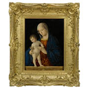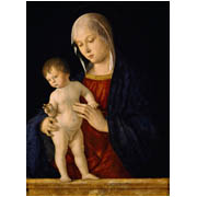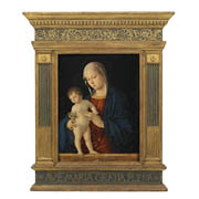 Characteristic of the many Virgin and Child compositions of Bellini’s mid-career is the portrayal of the Virgin in half length behind a marble parapet, which serves both as a firm base for the triangular figure composition, and as a way of separating the sacred space of the figures from the real world of the viewer. Unusual in this instance is the fact that the figures focus their attention beyond the picture to the lower left, almost as if the Child was blessing an unseen kneeling donor. The painter has used a dark, neutral background, instead of a curtain, landscape or sky. X-radiography has shown the dark background to be original, and Bellini employs it in several of his other devotional half-lengths, including the important, probably closely contemporary, ‘Virgin and Child with Two Female Saints’ (today in the Gallerie dell’Accademia, Venice).