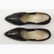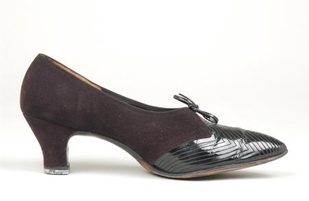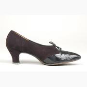 Woman's shoe of black suede, one of a pair, with pointed patent leather toes and bows, label 'Hutchings Model, a shoe of beauty and a joy to wear', circa 1956-1959