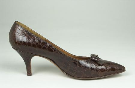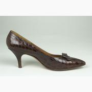 Woman's shoe of brown crocodile leather, stiletto heel, pointed toe with bow trim. Label marked in gold on insole 'Mcdonalds Ltd, Glasgow, Made by Turner'.