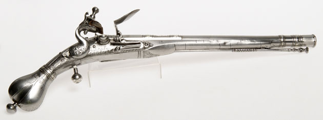 Steel and silver flntlock pistol with late dog lock, iron stock and heart butt.