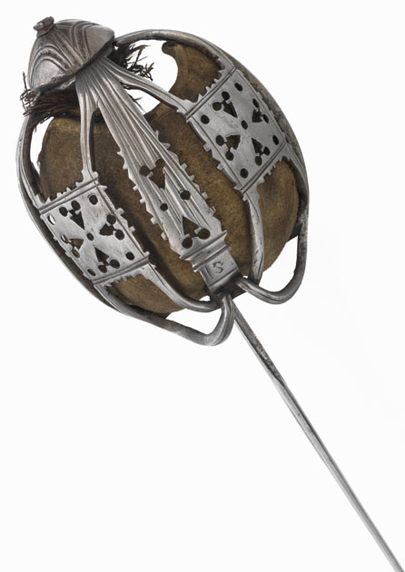 Basket-hilted sword, the knucklebow of the pierced basket hilt marked 'IS', the initials of the maker John Simpson the elder (admitted a freeman of the Incorporation of Hammermen of Glasgow, 22 August 1683). The imported German blade is inscribed 'GOTT BEWAHR DIE AUFRECHTE SCHOTTEN' ('God protect the upright Scots') circa 1720.