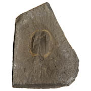 Dithyrocaris testudinea is a phyllocarid or pod-shrimp, a type of crustacean related to shrimps and lobsters. Today’s phyllocarids are marine and have a worldwide distribution. This example is complete and well preserved and is about 6cm long. The shell or carapace is divided into two equal parts. These are roughly oval and the surface has a pattern of closely-spaced, raised lines. The body projects from under the carapace and the tail ends in three spines.