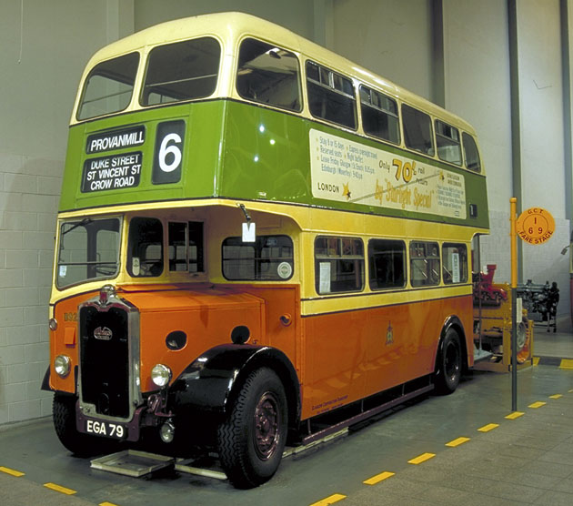 Glasgow Corporation Transportation motor bus, Albion Venturer E.G.A.79 from 1949. It is signed as the No. 6 service to Provanmill.