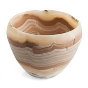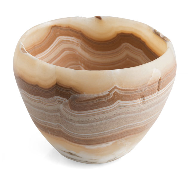 From the earliest times the ancient Egyptians were highly skilled in the shaping of very hard stones into elaborate vessels for funerary use. This bowl has been skilfully worked from a block of aragonite so that the colourful pattern formed by its internal laminations is seen to maximum effect. The stone would have been quarried during an expedition organised by the king into one of the remote deserts bordering the Nile Valley. It was then painstakingly hollowed out using a bow drill, cranked boring tool and abrasives of a stone harder than aragonite, to be formed into this exquisite shape.