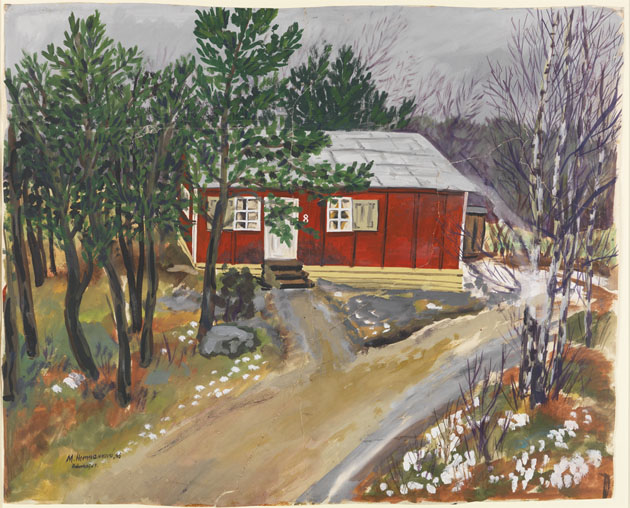 In November 1945 Marianne wrote to her friend Petr Erben: ‘I live in a small house with two bedrooms. One big, in which 8 girls stay, and one smaller where I live with my mum. It is very simple, iron beds, mattresses filled with wood wool, 2 sheets – you lie on one and cover yourself with the other (that’s the Swedish habit) and also blankets. Also, there are 4 wardrobes, but very narrow, you know like those in swimming pool or tennis court locker rooms. A few little chairs without backrests, table, a huge stove that overheats that little room terribly, and 3 windows. In the corner I paint and some of my pictures always hang there, and it is always messy there (or at least Mum says so, I don’t mind paints and dirty brushes) and it smells of turpentine. I hope you can imagine it all. We eat at a canteen which is quite inconvenient because it rains badly all the time.’ Despite this, there is obvious pleasure expressed in this painting, the red chalet nestles among silver birches and evergreens.