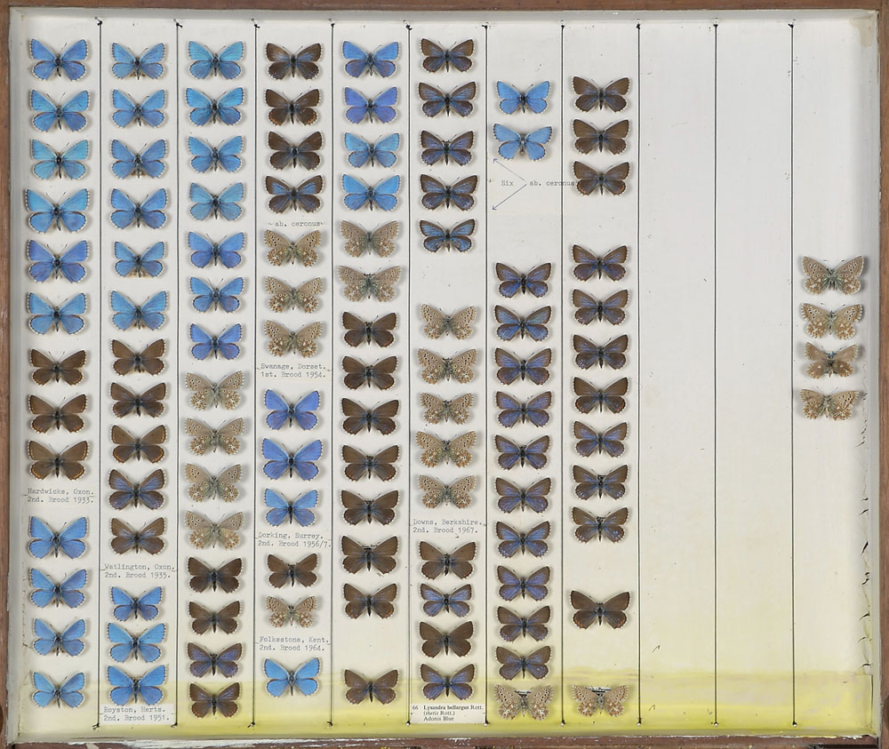 The bright blue butterflies in this drawer are male Adonis Blues. The dark brown Adonis Blue butterflies with blue near the wing base are females. The scientific term for this type of difference is sexual dimorphism. The paler brown butterflies with white and black spots are Adonis Blue butterflies that are pinned to show the underside of their wings.