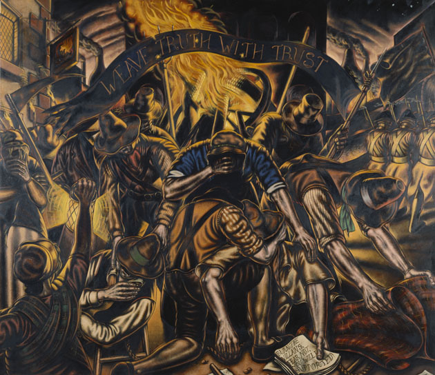 This Glasgow History Cycle panel depicts the aftermath of the Calton Weavers massacre on 3 September 1787 when the local military fired on a demonstration of striking weavers. In the centre the weavers attend to the dead and wounded as the soldiers march away to the right. One of the injured weavers clutches a pamphlet, which contains the text from a placard from the later 1792 riots. Above their heads is a banner ‘Weave Truth With Trust’, the motto of the weaving craft for many centuries. The scene is illuminated in the background by burning looms and webs, essential for handloom weaving. The bottle kilns along the skyline represent the recent and coming industrialisation of the area. The mural was commissioned for the People’s Palace dome to mark the bicentenary of the massacre of the Calton Weavers in 1987..