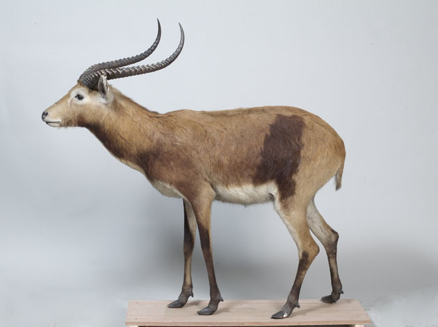 Black Lechwe, adult male, mounted standing on wooden base. The Black Lechwe is a supspecies of the Lechwe, and occurs in Zambia.