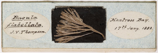 This sea mat or bryozoan (Bugula flabellata) was collected in Montrose Bay, Scotland in 1883. This specimen is important as it is a good example of 19th century collecting and presentation. It has been beautifully preserved and mounted on a microscope slide.