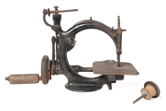Sewing machine by 'Willcox & Gibbs Sewing Machine Co, New York, London Paris', portable type. Consists of an arched mid-section with a rectangular sewing plate at one end and a rotating section at the other, operated via a turned wooden handle.