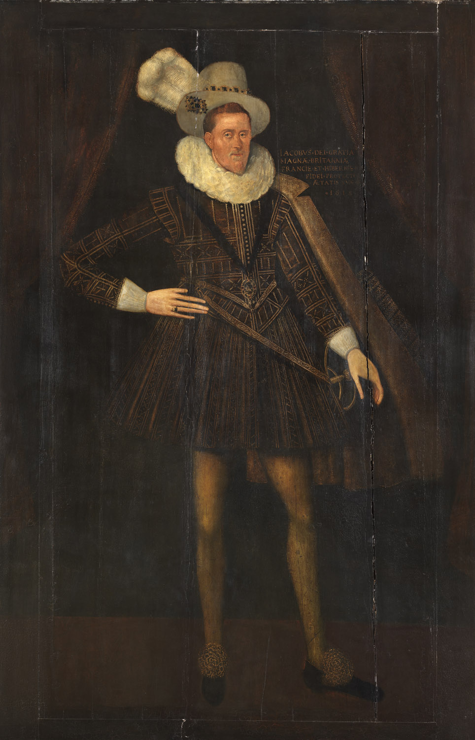 King James VI of Scotland was born on 19 June 1566 in Edinburgh Castle to Mary, Queen of Scots and her second husband, Lord Darnley. Darnley was murdered in February 1567 and in July Mary was forced to abdicate in favour of her infant son. A succession of regents ruled Scotland until 1576, when James became nominal ruler. In 1581 he assumed full powers and proved an effective ruler of Scotland's facrtious factional religious and political groups. In 1586, the Treaty of Berwick made he and Queen Elizabeth I of England allies. When his mother was executed the following year, James expected Queen Elizabeth to name him her successor and the Stuarts becoming the British royal family. In 1589, he married Anne of Denmark. Three of their seven children survived into adulthood: Henry, Charles and Elizabeth. In March 1603, Queen Elizabeth died and James did become King James I of England, Ireland and remained King James VI Scotland. This established the Stuart British monarchy which ended with the death of Queen Anne in 1714. King James I and VI moved to London. Although promising to visit Scotland every three years he came but once in 1617. He backed peace in Europe through a peace with Spain in 1604 and survived survived the Roman Catholic plot to blow him and Parliament up in 1605. King James I and VI looked to establish a British identity and uniformity. He approved the design of the British flag merging the England and Scottish flags ( the union flag), and he also looked to establish a uniformity in Anglican/Church of England worship which was harder to impose on Scottish Presbyterians and Roman Catholics. In 1611 he introduced the Authorised King James's Version of the Bible - the standard text for the next 250 years as indicative of his approach to uniformity or conformity in worship. In later years in 1613 his daughter Elizabeth married Frederick, Elector of the Palatinate, and was briefly Queen of Bohemia. She eventually settled in Holland in later life and through her the later Hanoverian monarchy had claim to the British throne. King James I and VI died on 27 March 1625 of natural causes. He was succeeded by his second son, Charles who became King Charles I - the same year that he married Henrietta Maria, a Roman Catholic daughter of King Henry IV of France.