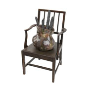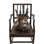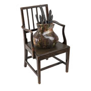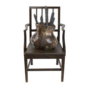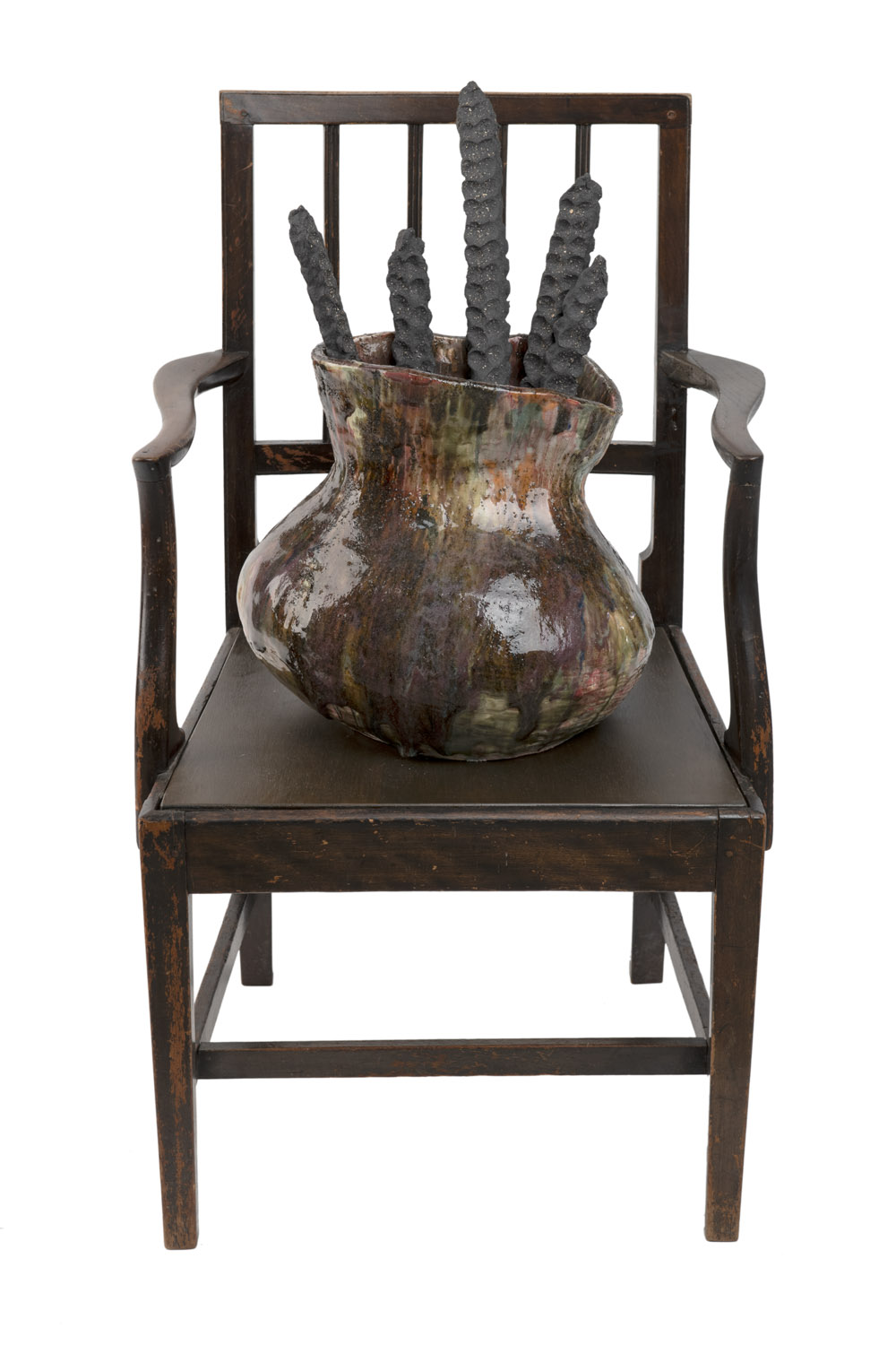 This sculpture by Glasgow-based artist Rachel Mimiec is a hand-built glazed ceramic in the shape of a pot filled with ceramic wheat forms that sits on a chair.