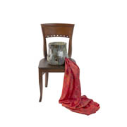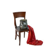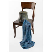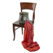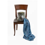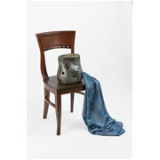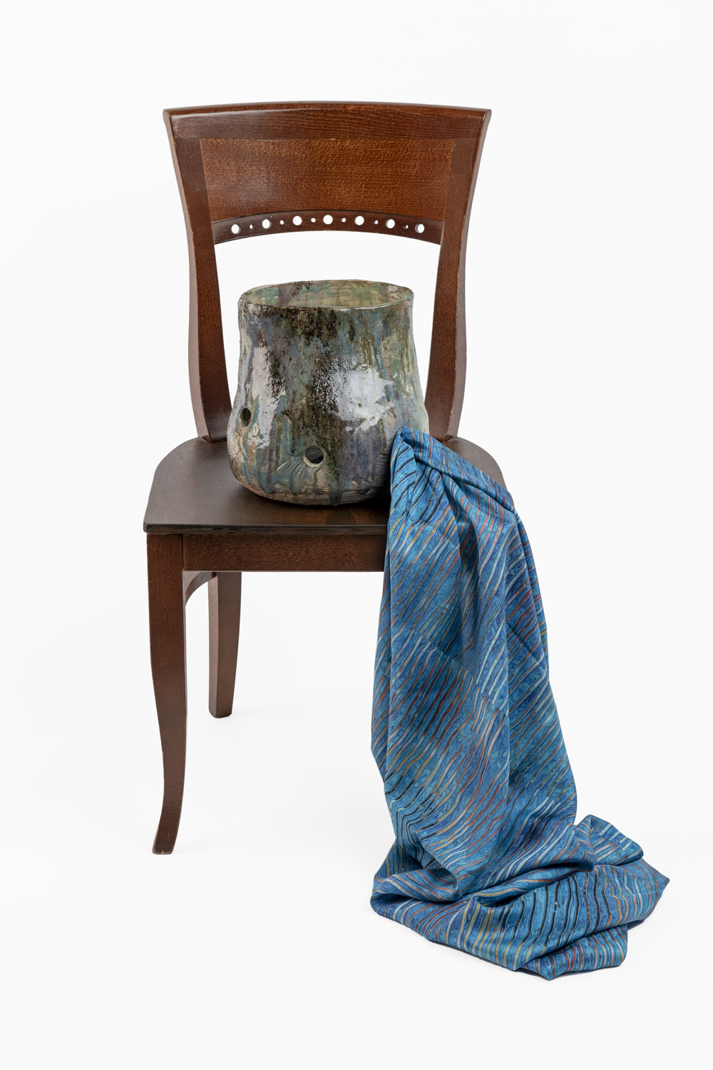 This sculpture by Glasgow-based artist Rachel Mimiec is a hand-built glazed ceramic in the shape of a pot with a square of digitally printed silk that emerges from a hole cut into the side of the pot. The work sits on a chair.