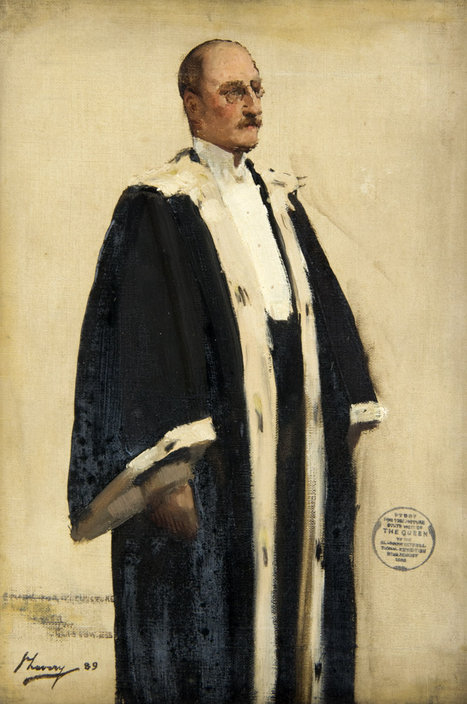 A portrait study of fruit merchant, patron of the arts and councillor Bailie Michael Simons (1842-1925) standing in his ermine-lined robes for John Lavery’s painting of the State Visit of Her Majesty, Queen Victoria to the Glasgow International Exhibition, 1888. Simons, the first Jewish member of the Corporation of Glasgow, was one of organisers of the 1888 International Exhibition and convenor of its Refreshments, Music and Entertainments committee.