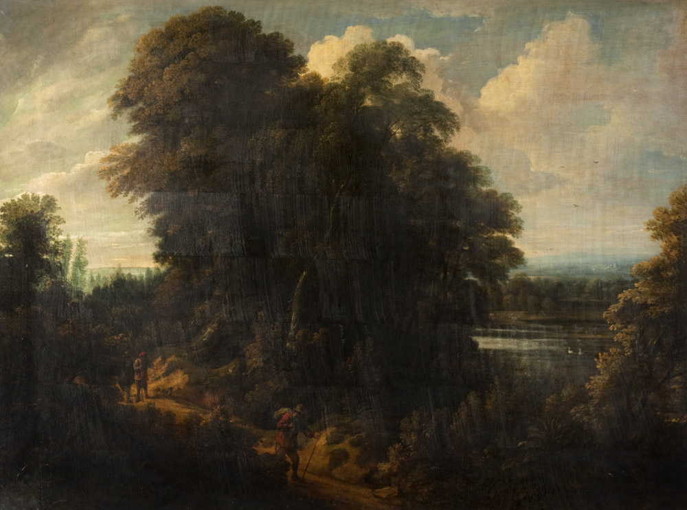 In foreground, a road between wooded banks along which three peasants are travelling; to right, a pond with ducks, and beyond, an open landscape; hills in distance. Figures by Teniers the elder.
