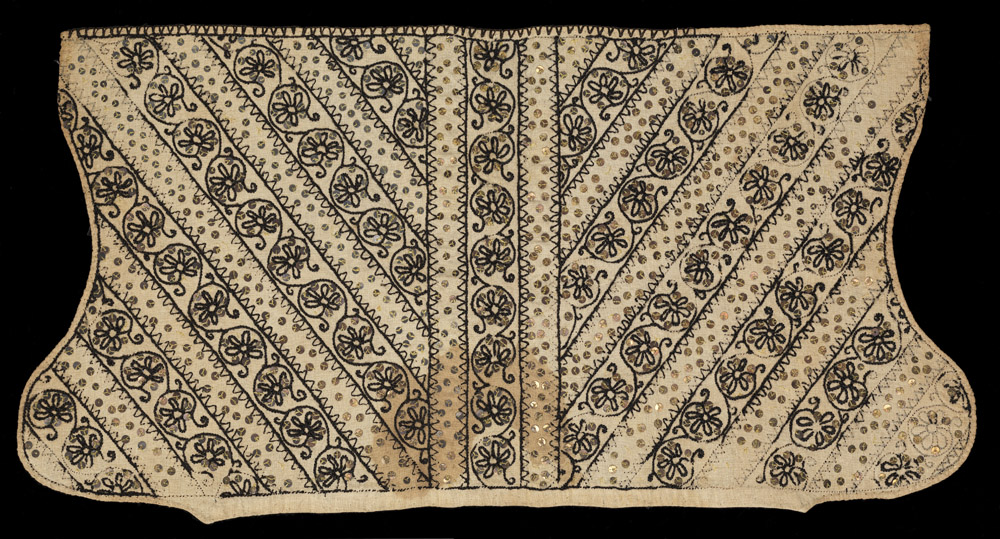 Woman's coif in plain-weave linen (approximately 34 threads per centimetre) embroidered in blackwork in black silk thread worked in stem, outline and double-running stitch decorated with silver spangles with three rows down the centre and diagonal rows either-side alternating between thin coiling stems ending in daisy-type five-petalled flowers with silver and silver-gilt spangles within the scrolls worked in stem and outline stitch (25mm wide) and bands with zig-zag borders worked in double-running stitch and scattered spangles (17.5mm wide in the centre, 23mm wide in the diagonal bands). Where the black silk thread has disintegrated the drawn design can be seen below. Top edge hemmed with a decorative edge, with sides hemmed with black stitch line around edge of design. Un-worked band along the bottom edge turned up to form casing for a drawstring.