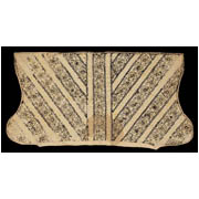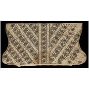 This coif is embroidered with a monochromatic design in black silk thread known as blackwork. Many, but not all, designs were worked with counted stitches and the monochromatic designs were also worked in red, blue or other colours. Blackwork is thought to have originated in North Africa with early surviving examples from Egypt dating to the Mamluk period (1250–1517), including textile fragments in the Yousef Jameel Centre for Islamic and Asian Art, Ashmolean Museum, Oxford (for example EA1993.152). The Umayyad Caliphate introduced the style to Spain where by the late 1400s it had spread from Mudéjar art into court dress. One of the earliest formal portraits depicting its use is Juan de Flandes, Isabel of Castille, circa 1500–04 (Palacio Real, Madrid). Isabel's daughter, Catherine of Aragon (1485–1536), is said to have introduced the style to England when she married Arthur Tudor (1486–1502), Prince of Wales, son of Henry VII (1457–1509), in 1501. Often referred to in England as Spanish work at this date, it can be seen decorating shifts in several early Tudor court portraits by Hans Holbein the Younger (circa 1497–1543) and his peers. By the late 1600s it was also being used to decorate accessories, main garments and domestic textiles.