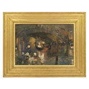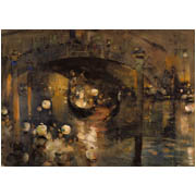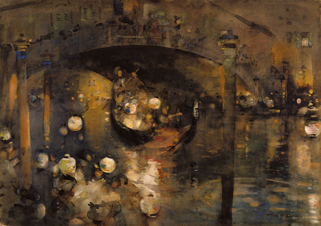 Melville first travelled to Venice in February 1894, his visit coinciding with the annual carnival when the canals came alive with lanterns and music boats. He transforms the city into a decorative arrangement of form and colour. The Japanese lanterns remind the viewer of how inspirational Japanese prints were for innovative artists in the 19th century, in radically challenging Western ideas about design. The focus on the bridge and vertical canal posts are very reminiscent of Japanese ukiyo-e prints. The musical reference and nocturnal setting both reference the work of the controversial American artist and aesthete James McNeill Whistler. ‘The Music Boat, Venice’ is technically brilliant, Melville using dabs of colour to merely suggest form, creating an almost abstract pattern. He cleverly exploits the thinness and runs and blots of the watercolour medium to create reflections in the water and suggest the ethereal beauty of the scene.
