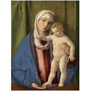 One of the many images of the Madonna and Child by the artist, this was painted by Giovanni Bellini around the year 1475, It shows the Virgin Mary gently supporting Jesus who is balanced on a marble balustrade running across the foreground of the picture. There are balustrades in many of Bellini’s paintings of the Madonna and Child, simultaneously inviting the viewer to worship while maintaining an element of distance. Jesus holds up his right hand in the traditional gesture of blessing, and both he and Mary look down calmly towards the viewer, thus giving the impression that he or she is being blessed by the Christ Child himself. The painting has been much overpainted and badly cleaned in the past, but nonetheless the serenity of the image against the dark background is still most effective and beautiful. It was thought that the plain background might cover a landscape scene, as fond in some similar works, but x-ray photographs show that there is nothing drawn or painted underneath the black layer.