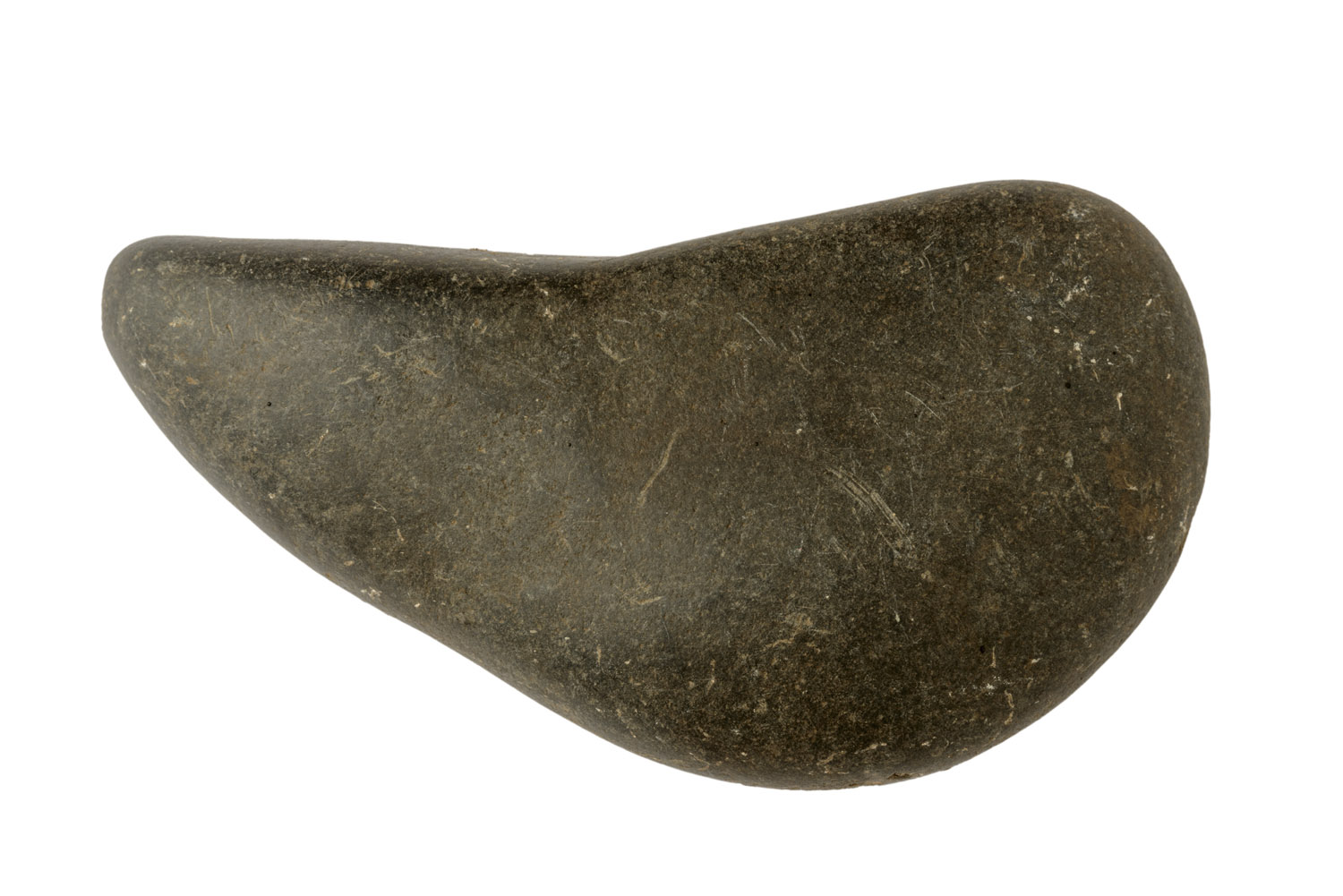 Pebble polisher of grey stone. Roughly teardrop-shaped. Use-wear at the pointed end.